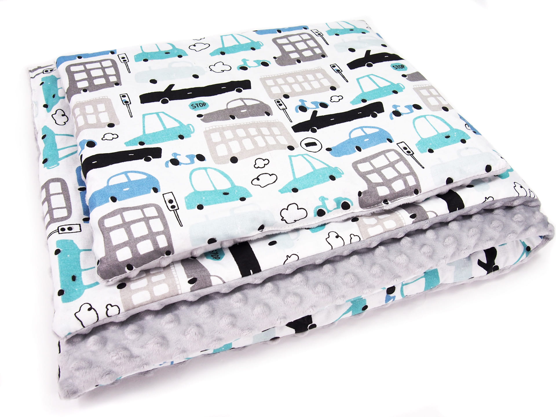 Kocyk 75 x 100 cm + podusia - Autka białe / Minky jasny szary