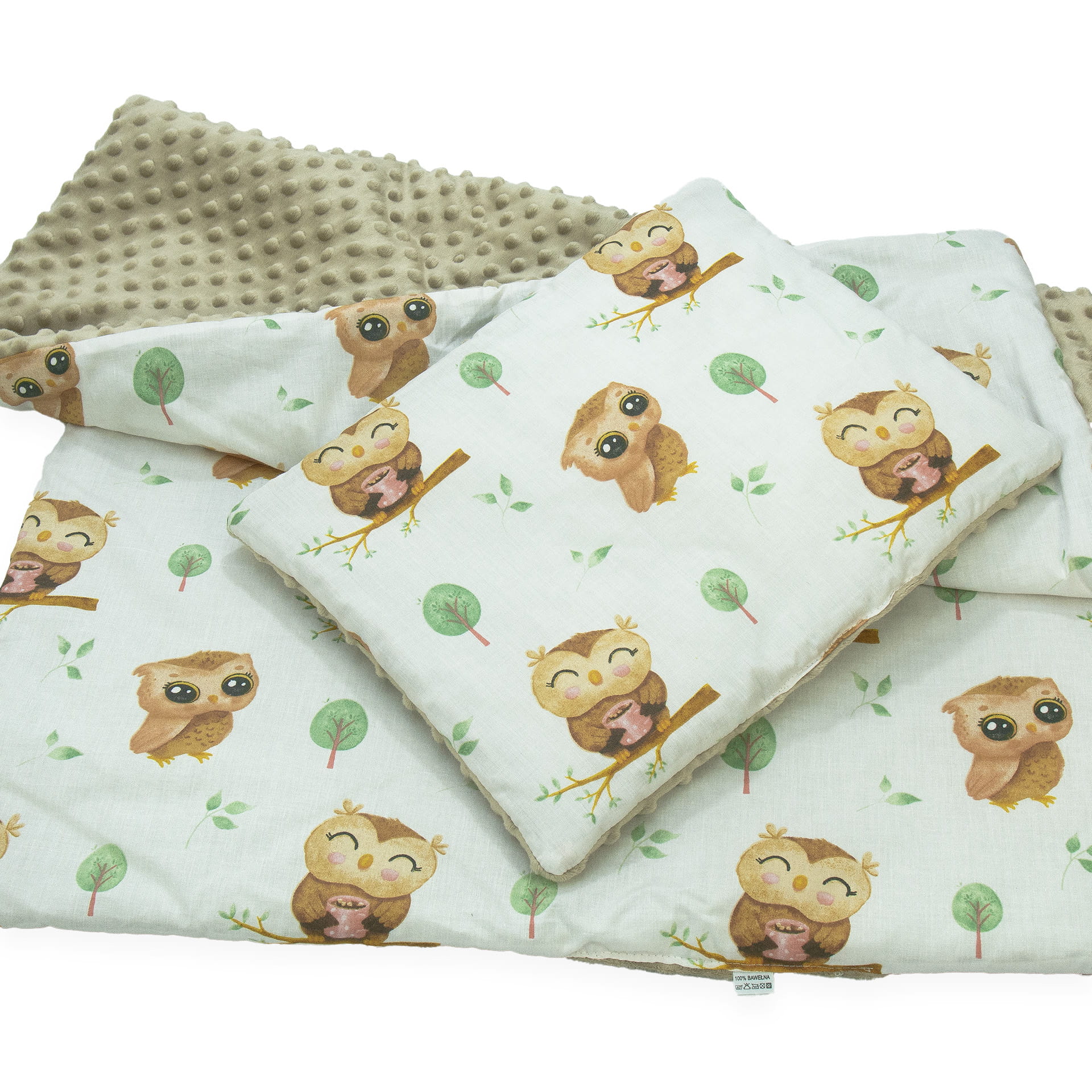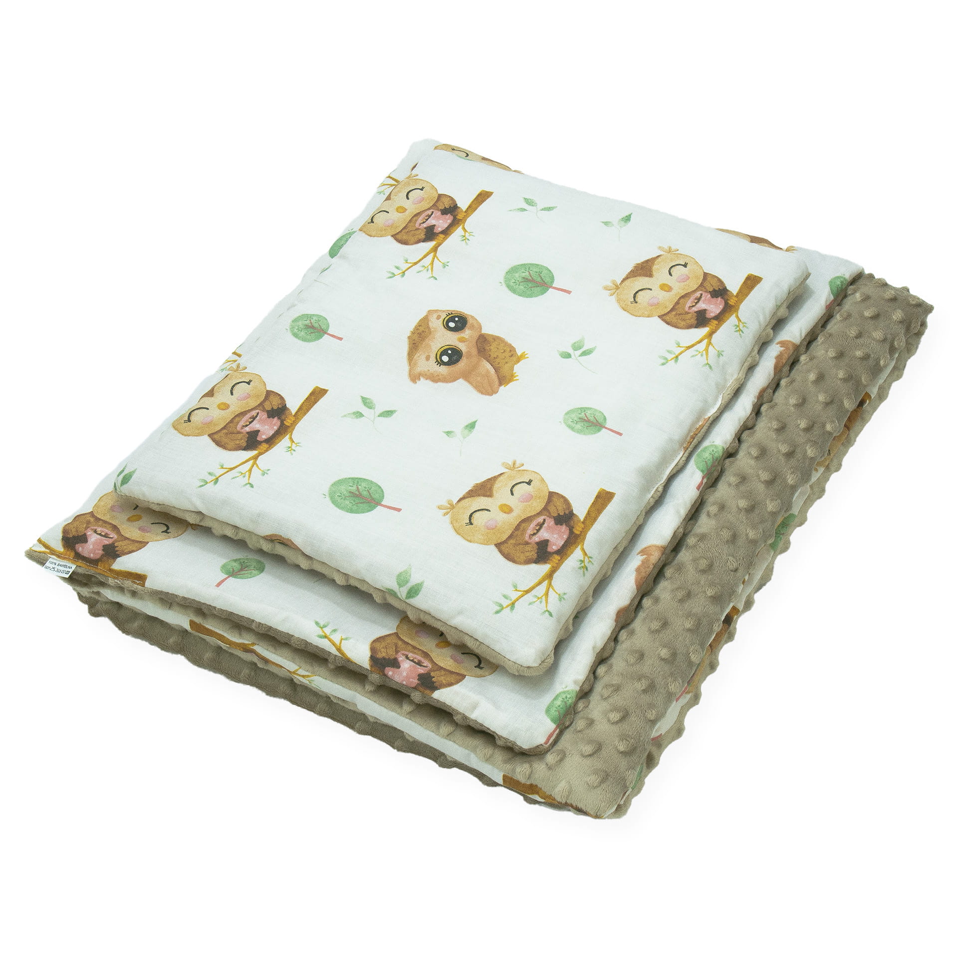 Kocyk 75 x 100 cm + podusia - Sowy beżowe / Minky kawowy
