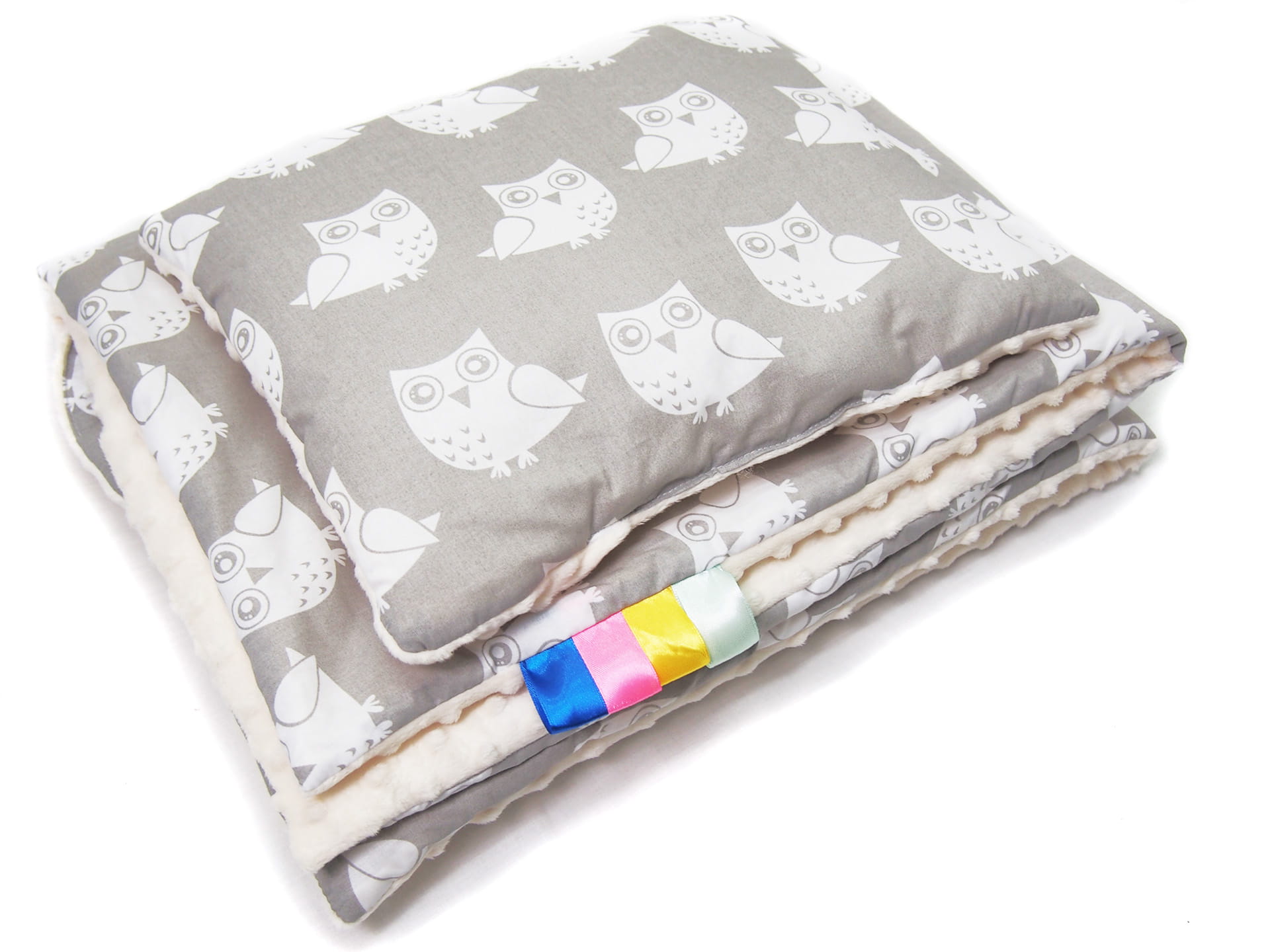 Kocyk 75 x 100 cm + podusia - Sowy szare / Minky kremowy