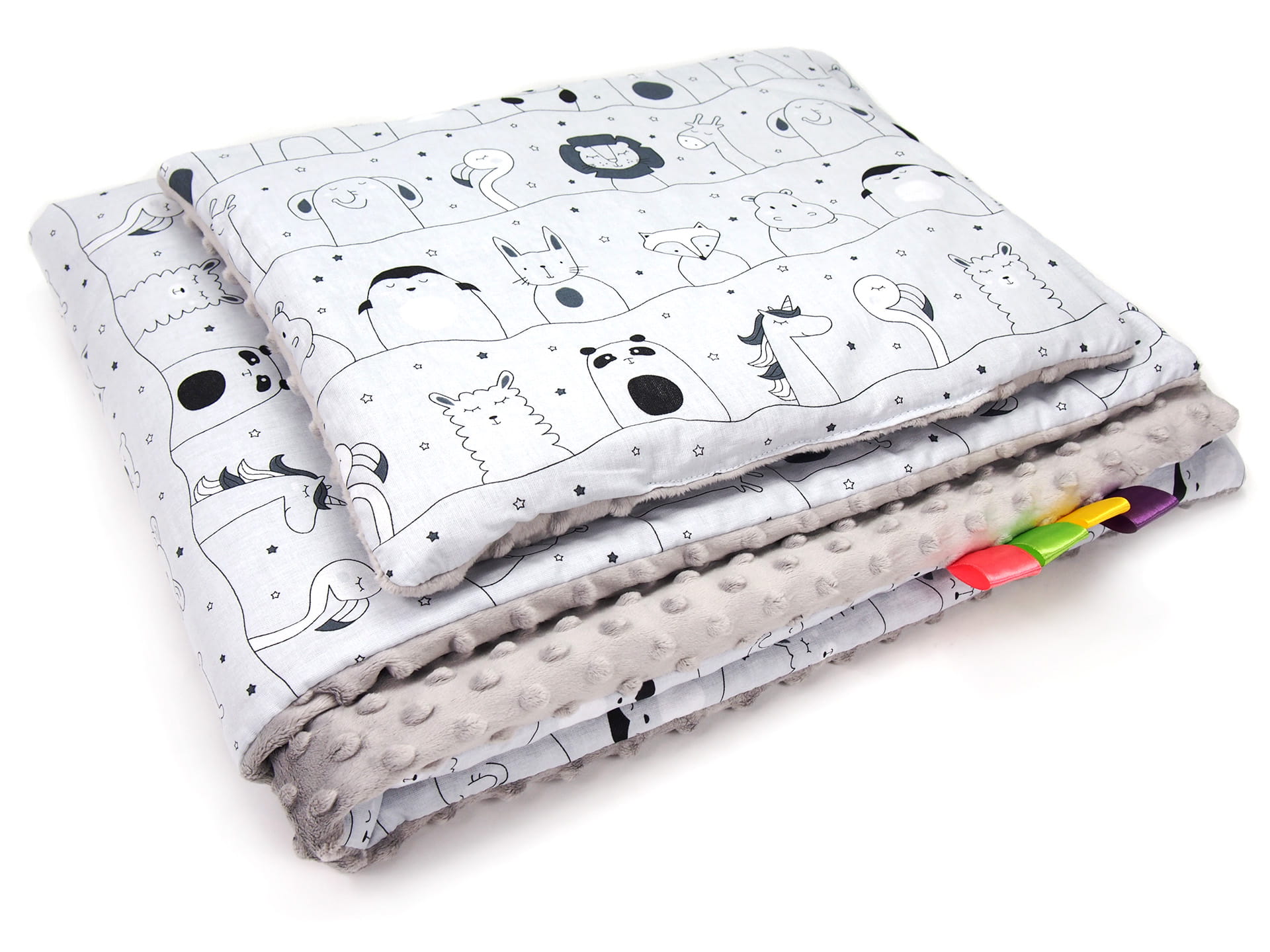 Kocyk 75 x 100 cm + podusia - Zwierzęta w teatrze szare / Minky szary