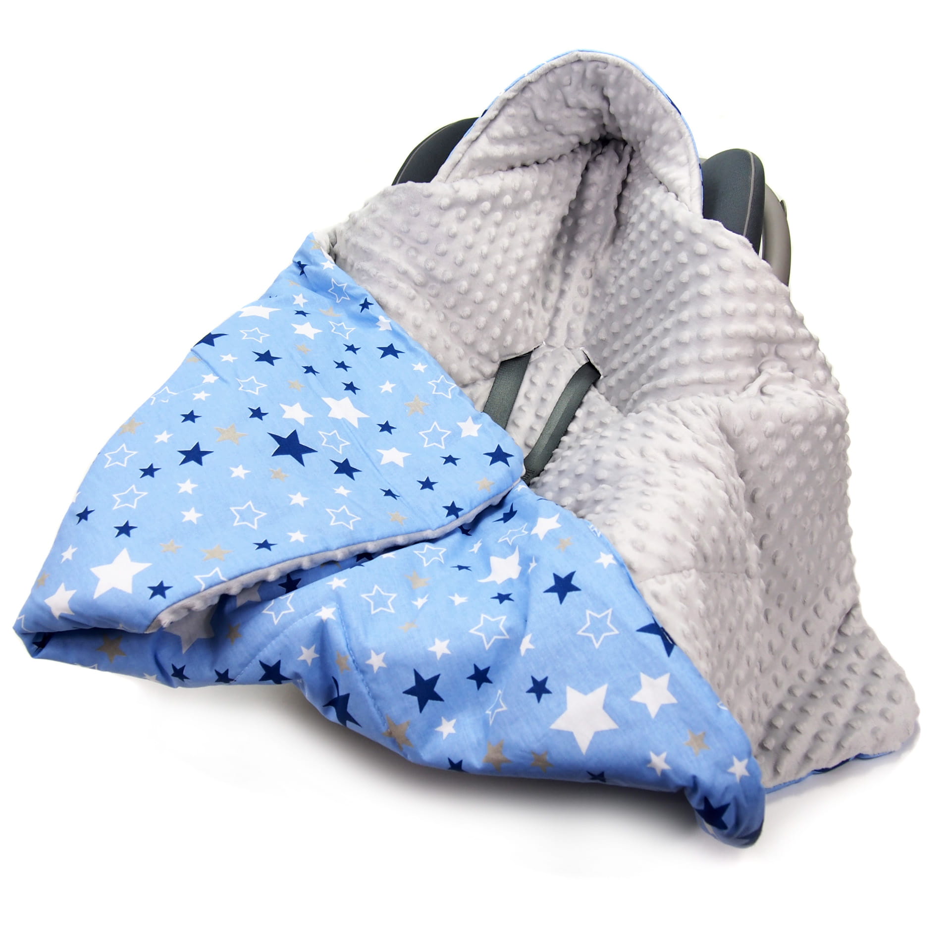 Dwustronny kocyk, okrycie do fotelika samochodowego oraz nosidełka. Kocyk wykonany jest z jednej strony z dzianiny Minky, a z drugiej ze 100% bawełny.