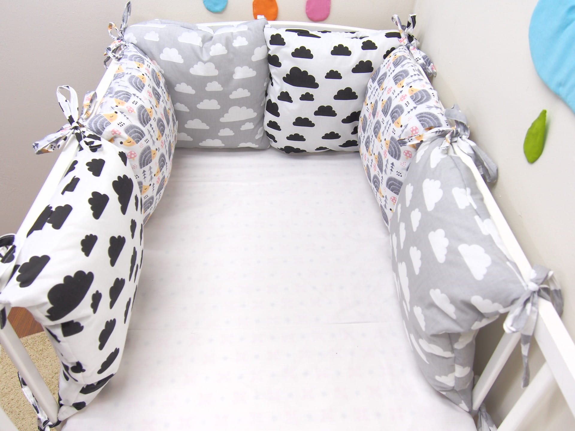 Ochraniacz składa się z 6 poduszeczek w rozmiarze 35 x 35. Każda poduszeczka posiada 4 wiązania (dwa u dółu oraz dwa na górze).