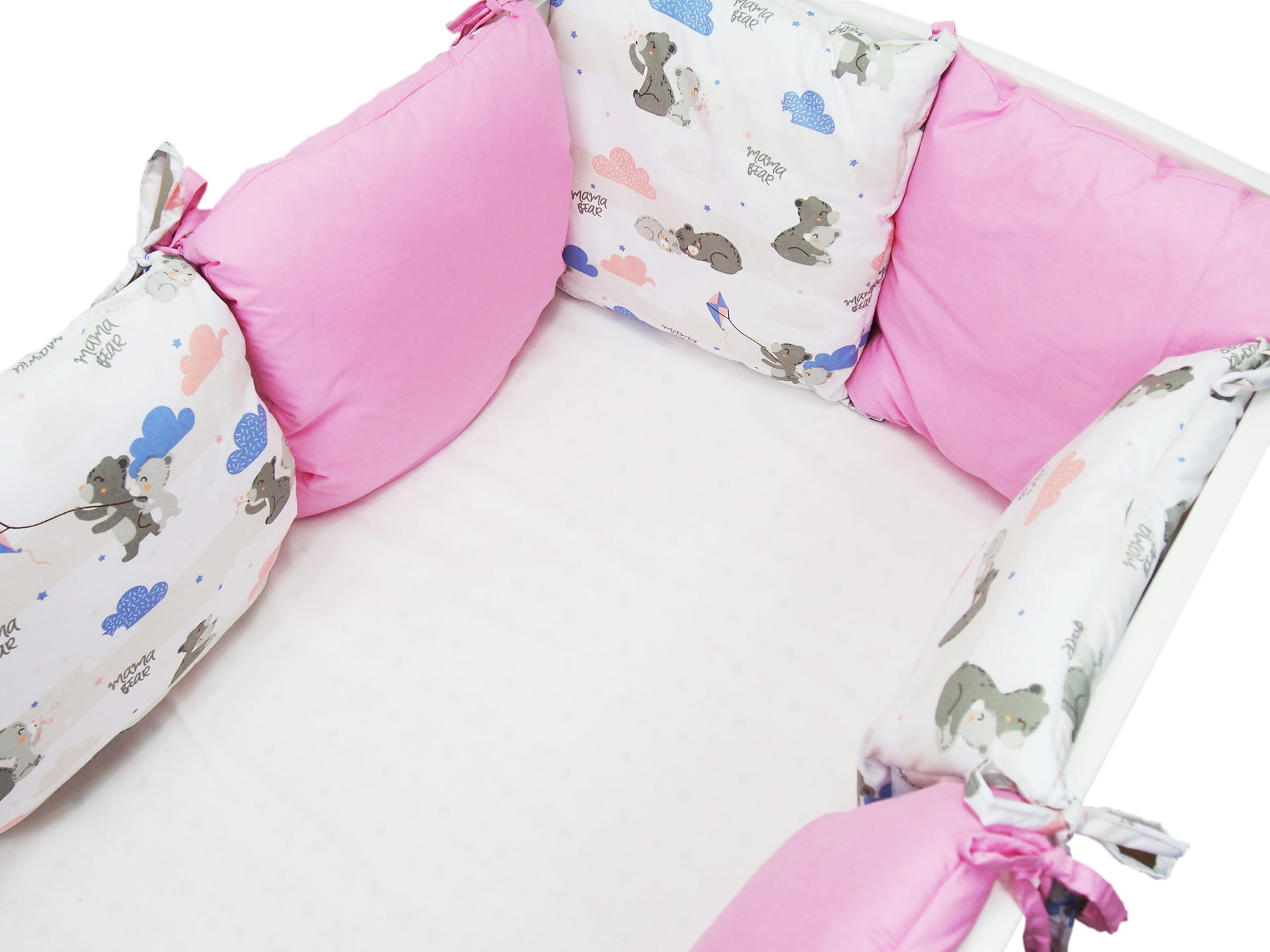 Ochraniacz składa się z 6 poduszeczek w rozmiarze 35 x 35. Każda poduszeczka posiada 4 wiązania (dwa u dółu oraz dwa na górze).