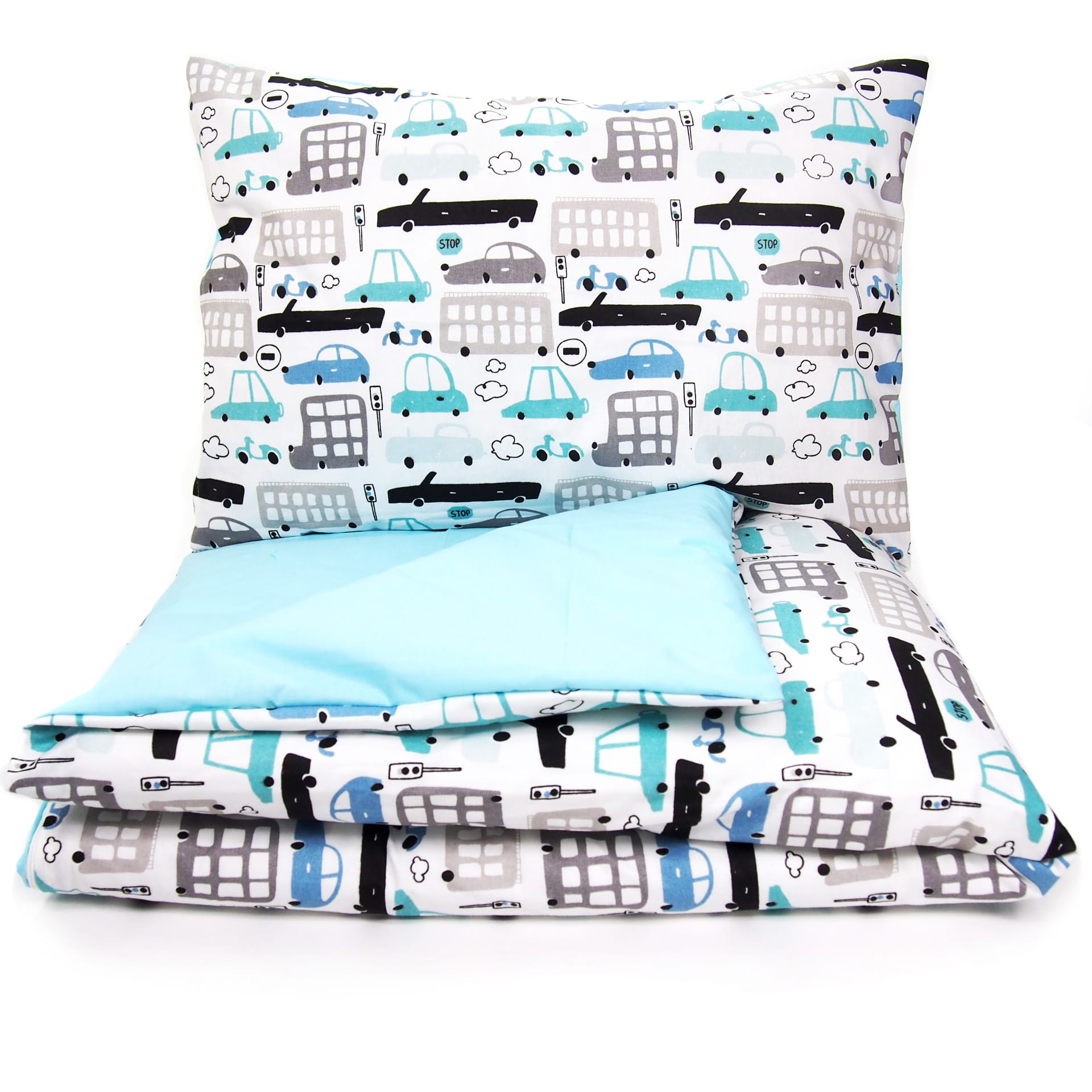 Pościel 135 x 100 - Autka białe / turkus